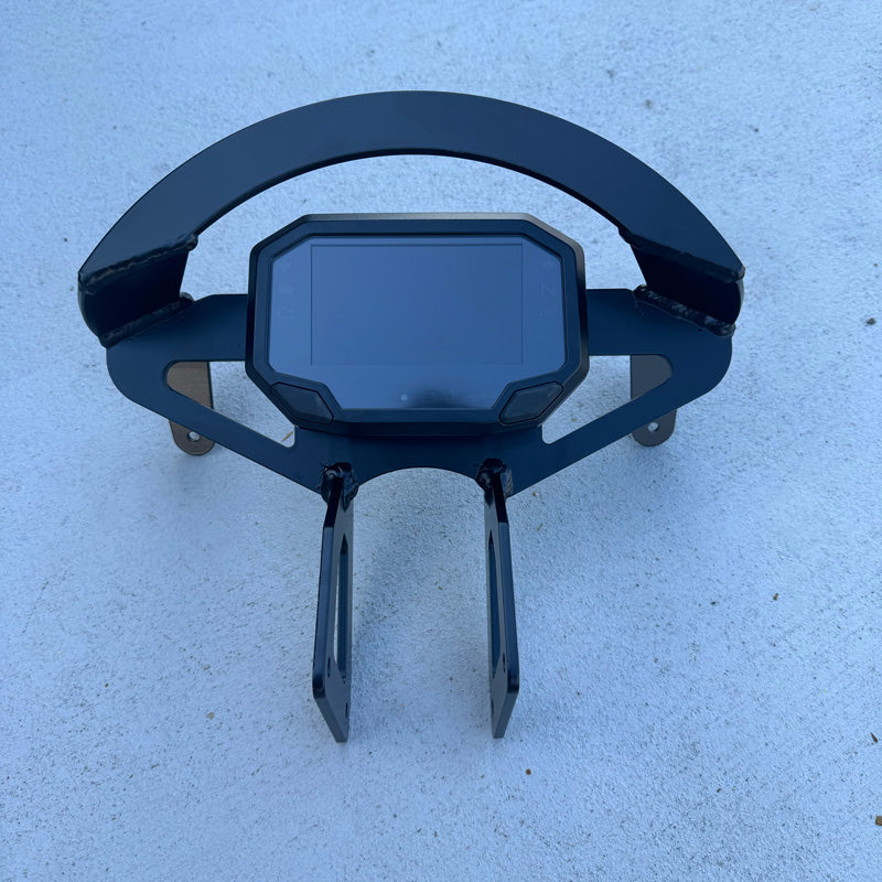 Heavy duty 3/16" steel CNC cut with weight reducing cutouts. This is a very strong upper stay with windscreen support and provisions to mount the OEM gauge using the OEM rubber bushings.