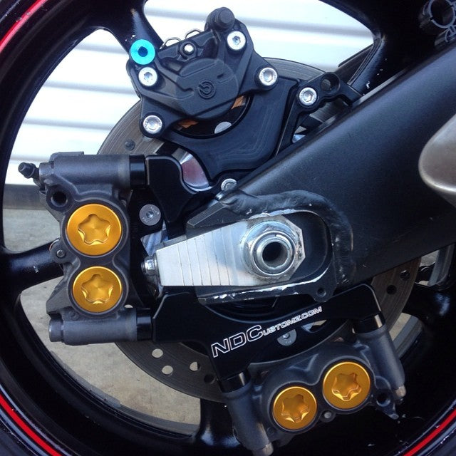 The bracket will hold up to 3 calipers including (2) 4 piston radial calipers and (1) OEM Kawasaki (TOKICO)03-12 foot brake caliper. There are foot brake caliper adapters available to hold the stock R6 caliper.