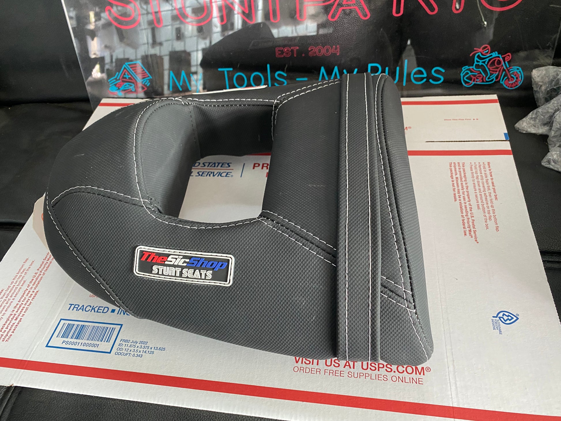 Rear Freestyle Seat - Foam Modification (2 inch Build-Up at rear of foot hole) + New Cover + Installation. Customized as follows: 1) Remove existing cover. 2) Replace most of the soft foam with denser foam. 3) Modify your seat base. (add foot hole) 4) Make custom cover. 5) Professionally install your new custom seat cover using the classic Gripper material.