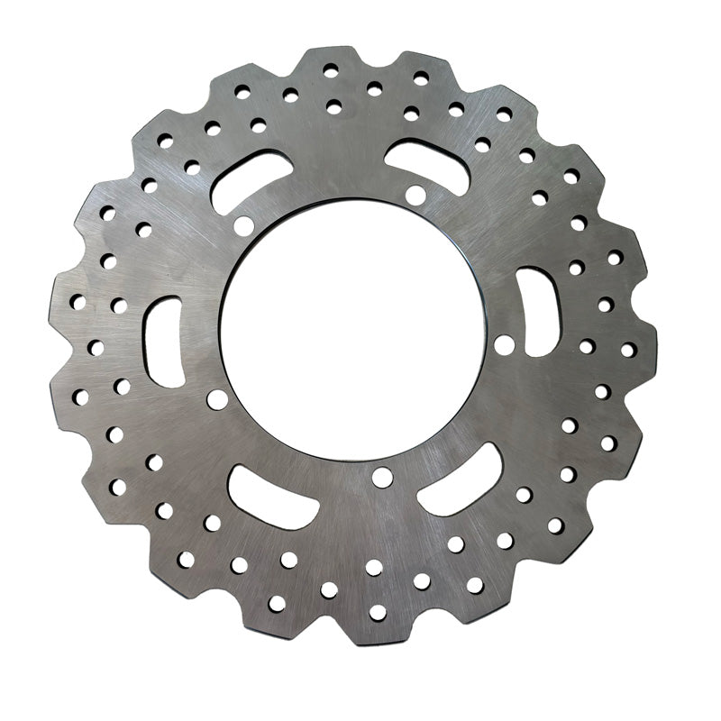 Heat treated stainless steel rotor cross drilled with slots and waved outer edge to help with heat dissipation and removal of brake dust.