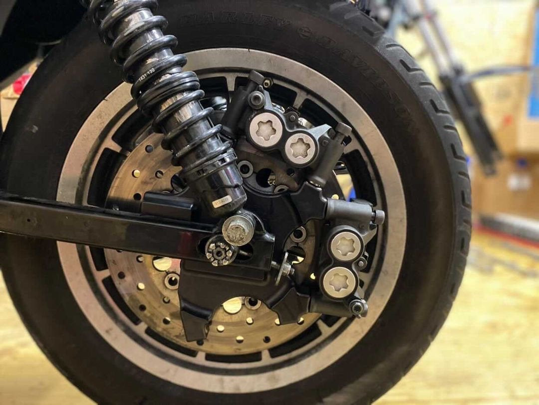 This is the 2004+ Harley Davidson Sportster Triple Caliper bracket designed to use Brembo M4 108mm 4-piston or 05+ Yamaha R6 monoblock calipers giving you superior braking power and the choice of running 1, 2 or even 3 calipers! (spacers may be required to accommodate other radial style calipers)