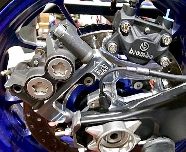 This bracket will take most radial mount calipers with the option of running a Brembo p32 or p34 caliper.